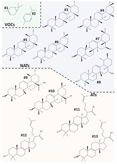 Among them, two were small-sized volatile organic compounds (Δ3-carene (#1); p-cymene (#2)), six were nonacidic pentacyclic triterpenes (α-amyrin (#3); β-amyrin (#4); α-amyron (#5); β-amyron (#6); brein (#7); maniladiol (#8)), two were acid pentacyclic triterpenois (oleanolic acid (#9); ursolic acid (#10)), and three were tetracyclic triterpenoids (elemonic acid (#11); α-elemolic acid (#12); β-elemolic acid (#13)).