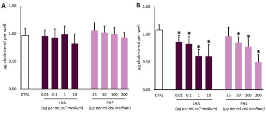 No significant decreases in cholesterol production were observed at the tested concentrations after 6 h of treatment with LHA or PHE (Figure 2A). On the other hand, both LHA and PHE were able to negatively affect the cholesterol amount in a dose-dependent manner upon 12 h incubation (Figure 2B). In particular, LHA lowered the cholesterol levels at all the tested dosages, with a decrement of about 50% at 1 µg mL−1 or higher concentrations. Our data are in good agreement with the literature for LHA [,,]. Regarding PHE, treatment with 200 µg of the gum resin extract was able to reduce cholesterol levels in a similar way to 10 µg mL−1 of the pure LHA molecule.