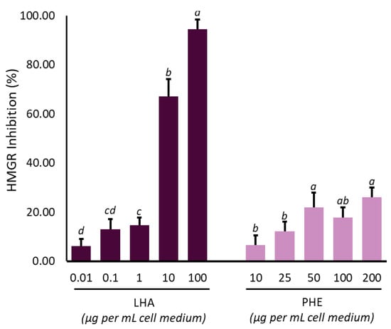 Effect of lovastatin hydroxy acid (LHA) and Protium heptaphyllum resin extract (PHE) on HMG-CoA reductase activity. Data are expressed as mean ± SD of three different replicates. Among the two conditions (LHA or PHE), different lowercase letters indicate significant (p < 0.05) changes among treatment concentrations, as calculated by one-way ANOVA analysis followed by Tukey’s test.