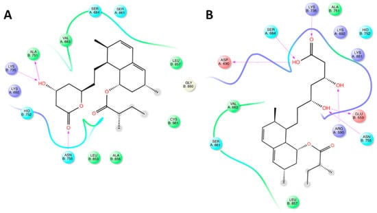 Maps of amino acid (AA) residues involved in the binding of lovastatin (A) and lovastatin hydroxy acid (LHA; (B)) into 3-hydroxy-3-methyl-glutaryl-coenzyme A reductase (HMGR).