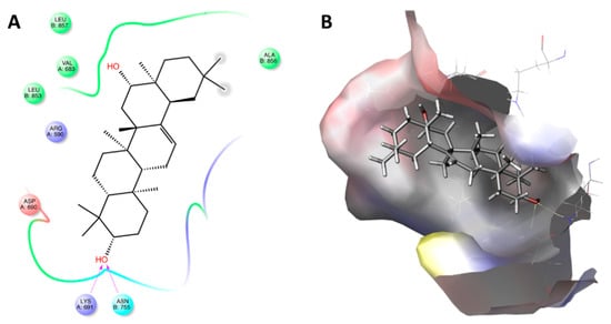 Molecular docking of maniladiol (#8) with the active site of 3-hydroxy-3-methyl-glutaryl-coenzyme A reductase (HMGR). Panel (A) shows the amino acid (AA) residues map of the binding. Panel (B) shows the 3D docking pose of the molecule into the hydrophobic cavity of HMGCR.