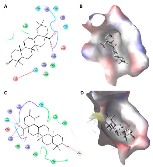 Molecular docking of oleanolic acid (#9) and ursolic acid (#10) with the active site of 3-hydroxy-3-methyl-glutaryl-coenzyme A reductase (HMGR). Panels (A,C) show the interactions between the amino acid (AA) residues in the active site of HMGR and oleanolic acid and ursolic acid, respectively. Panels (B,D) show the 3D docking structures of oleanolic acid and ursolic acid, respectively, inserted into the hydrophobic cavity of HMGCR.