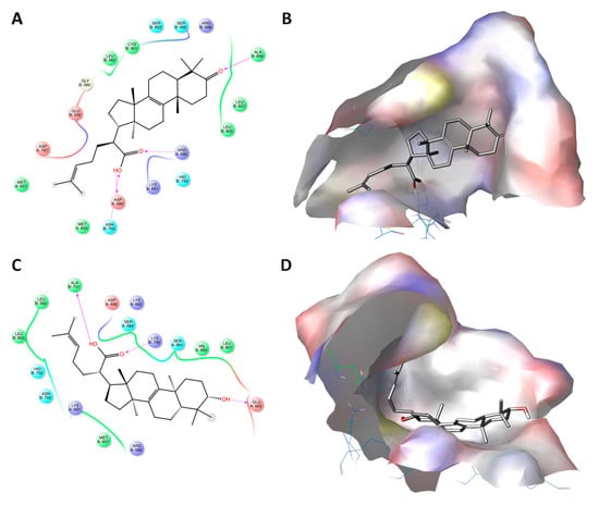 Molecular docking of elemonic acid (#11) and β-elemolic acid (#13) with the active site of 3-hydroxy-3-methyl-glutaryl-coenzyme A reductase (HMGR). Panels (A,C) show the interactions between the amino acid (AA) residues in the active site of HMGR and elemonic acid and β-elemolic acid, respectively. Panels (B,D) show the 3D docking structures of elemonic acid and β-elemolic acid, respectively, inserted into the hydrophobic cavity of HMGCR.