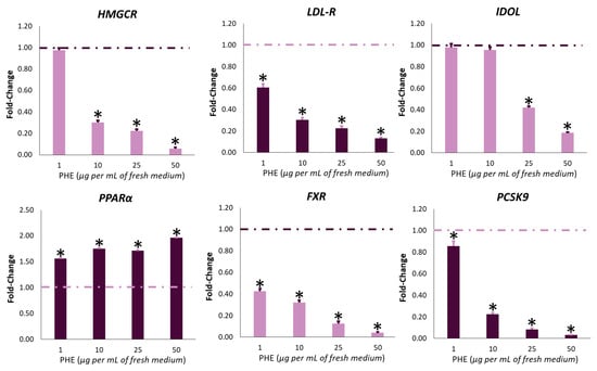 Increased activity of CYP7A1 is also associated with the activation of nuclear receptor PPARα (Peroxisome Proliferator-Activated Receptor α), which is principally involved in lipid metabolism regulation. Concerning cholesterol metabolism, PPARα activation intensely downregulates the expression of HMGCR [], promotes cholesterol conversion into bile acids [], and influences the absorption of cholesterol in the intestinal tract []. Consequently, the clinical use of PPARα agonists improves the overall plasmatic lipid profile and reduces cardiovascular risks []. In our experimental conditions, cell exposure to PHE increased the gene expression of PPARα. Surprisingly, already at the lowest PHE concentration, an upregulation of the transcript was observed (Figure 8).
