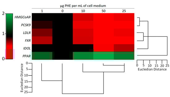 Effect of Protium heptaphyllum resin extract (PHE) on gene expression of HMGCR, LDL-R, IDOL, PPARα, FXR, and PCSK9 on HepG2 cells. After the seeding, cells were treated for 6 h with PHE. Untreated cells were used as control (dashed line). Bars represent the mean ± SD of three qRT-PCR analyses. Values are expressed as fold change with respect to the gene expression of control cells. The symbol “*”, when present, indicates significant (p < 0.05) differences between treated and control samples, as calculated by the Mann–Whitney test. Representative heat map analysis coupled with hierarchical cluster analysis is reported in Figure 9. HMGCR: 3-hydroxy-3-methyl-glutaryl-coenzyme A reductase; FXR: farnesoid X receptor; LDLR: low-density lipoprotein receptor; IDOL: inducible degrader of low-density lipoprotein receptor; PCSK9: proprotein convertase subtilisin/kexin type 9; PPARα: peroxisome proliferator-activated receptor α.