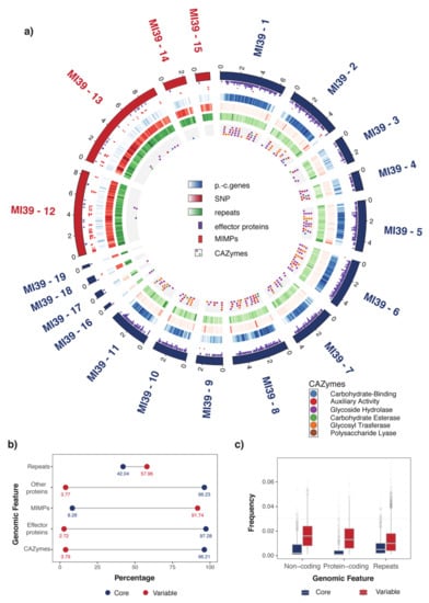 Previously, MI39 whole genome assembly chromosomes were assigned to core and variable (auxiliary, lineage-specific) compartments of the size of 47.55 and 21.77 Mb, correspondingly []. Chromosomes were assigned to the core compartment based on high levels of homology and synteny with the core chromosomes of F. oxysporum f. sp. lycopersici. The synteny-based partitioning is further supported by statistically significant differences in density of protein coding genes, single nucleotide polymorphisms (SNPs), and other genomic features (Figure 1 and Table 1). Thus, in contrast to the variable part, core chromosomes are characterized with much higher density of genes, lower densities of variants, and repetitive regions. In addition, the vast majority of CAZYmes and effector genes are also localized to the core part, whereas mobile DNA (and other repeats including miniature impala repetitive elements (MIMPs) is concentrated in the variable part (Figure 1b and Table 1). The partitioning of the MI39 genome into the core and variable compartments are further supported by significant differences in SNP density (Figure 1c), regardless of its origin e.g., protein-coding, non-coding, and repeats (the associated p-values are 2.5 × 10−225, 9.5 × 10−129, and 5.8 × 10−110, correspondingly).