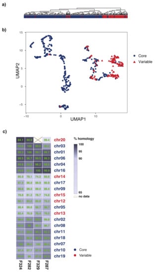 Compartmentalization of F. oxysporum f. sp. lini genome. (a) Hierarchical clustering of genomic regions in accordance with genomic characteristics associated with genome stability. Regions attributed to the Core part are marked with blue, whereas loci from the variable part are shown in red. (b) Visualization of genomic region clustering with uniform manifold approximation and projection (UMAP) reveals three groups of loci. (c). Homology heatmap for comparisons of the percentage identity between flax strains. The percentage identity is indicated by different box colors, whereas the numbers shown is the boxes correspond to percentage of overlap between chromosomes. Chromosome labels are highlighted according to genome compartmentalization.