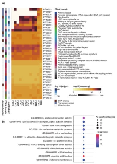 A comprehensive genome-wide annotation of FOLINI was performed using the PFAM database, a collection of protein families based on functional domains. PFAM domain frequencies were computed for proteomes of 11 Fusarium species obtained from Ensembl Fungi (i.e., F. oxysporum f. sp. cubense, F. oxysporum f. sp. meloni, F. oxysporum f. sp. lycopersici, F. oxysporum f. sp. pisi, F. oxysporum f. sp. vasinfectum, F. oxysporum f. sp. cotton, F. oxysporum f. sp. raphani, FO47 strain, F. oxysporum f. sp. radicis, F. oxysporum f. sp. conglutinans, Fusarium verticilloides) and MI39 proteome. Domain enrichment analysis revealed a group of 35 PFAMs significantly over-represented in LS compartment of MI39. Unsurprisingly, the core part is quite homogeneous in terms of domain repertoire, whereas the LS compartment shows noticeable differences between various formae specialis (Figure 3a and Figure S3), thus indirectly underpinning a theory regarding a pivotal role of variable compartment in host adaptation. Interestingly, domain spectrum of MI39 variable proteome is most similar to that of banana pathogen (F.oxysporum f. sp. cubense race 4, GCA_000350365). Both proteomes are characterized with relatively high frequency of domains associated with activity of transposable elements apparently absent in other f. spp.