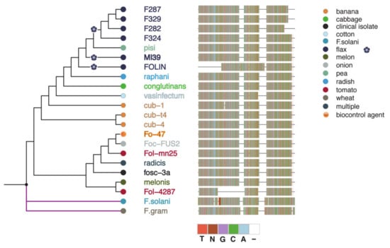 Bayesian phylogeny of Fusarium oxysporum isolates from flax and other hosts. The phylogeny is inferred from the maximum likelihood analysis of concatenated alignment of RPB2-TUB2-EF1α and is rooted on the outgroup comprised of F. solani and F. graminearum branch). Tree tips and label colors reflect the pathogen’s host. The color-coded nucleotide sequence alignments are shown to the right of the tree.
