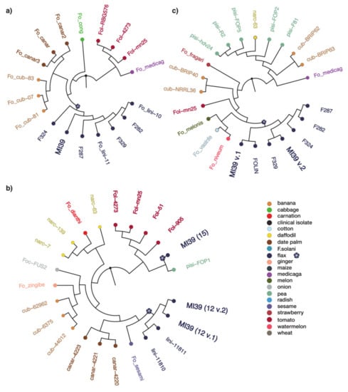 Further in-depth analysis was carried out to confirm whether f. sp. lini at all has polyphyletic or monophyletic origin. We tested F. oxysporum f. sp. lini strains collected from different locations and constructed a phylogenetic tree based on alignment of EF1α sequences (Figure S4). The resulting tree exhibits at least 4 distinct clonal lineages distributed in different F. oxysporum clades, confirming that f. sp. lini cannot be defined as monophyletic group. This finding is in good agreement with previous phylogenetic analyses of Fusaria from flax [].