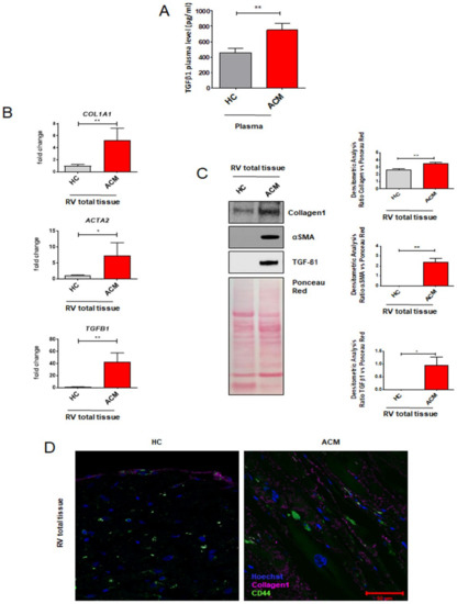 2.1. Arrhythmogenic Cardiomyopathy Patient-Derived Tissues Exhibit Higher Fibrosis and TGF-β1 Levels Than Healthy Controls