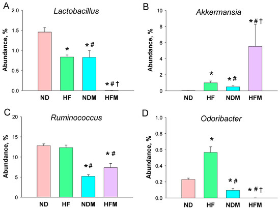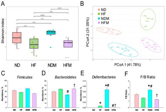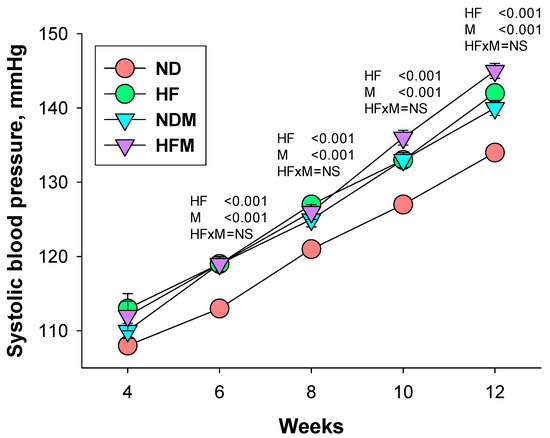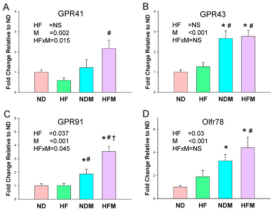 | Groups | ND | HF | NDM | HFM | p-Value | ||