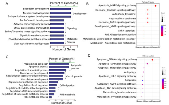 Gene Ontology and Kyoto Encyclopedia of Genes and Genomes (KEGG) analysis of differentially expressed lncRNAs (DE-lncs) target genes. (A,C) GO categories (biological process) of differential lncRNA cis-target genes (A) and trans-target genes (C) in granulosa cells from AA versus HA follicles. (B,D) KEGG analysis of differential lncRNA cis-target genes (B) and trans-target genes (D) in granulosa cells from HA versus AA follicles. The size and color of each bubble represents the number of genes in each pathway and P value respectively. HA, heathy antral; AA, atretic antral.