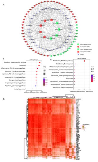 Based on our RNA-seq data a lncRNAs-miRNA-mRNA interaction network was constructed using Cytoscape. The top five up-regulated lncRNAs and the top five down-regulated lncRNAs were selected to identify lncRNA-miRNA interactions based on TargetScan and miRanda analysis (Figure 4A). KEGG pathway analysis of the targeted up-regulated mRNAs indicated that cell programming death pathways like autophagy and apoptosis-related pathways including “Hippo signaling pathway”, “Apoptosis”, “TNF signaling pathway”, “TGF-beta signaling pathway”, “HIF-1 signaling pathway”, “FoxO signaling pathway”, and “p53 signaling pathway” were highly enriched (Figure 4B). Downregulated potential mRNA targets were primarily associated with metabolic pathways including “Metabolic pathways”, “Thermogenesis”, “Oxidative phosphorylation”, “Circadian entrainment”, and “PPAR signaling pathway”. Additionally, ovarian steroidogenesis pathways including “Ovarian steroidogenesis” and “Steroid biosynthesis” were also enriched in the downregulated potential mRNA targets (Figure 4C). In line with these results, a correlation analysis based on Pearson coefficient showed that the upregulated lncRNAs were significantly associated with mRNA expression of 62 apoptosis related genes (Figure 4D), indicative of a direct role of lncRNAs in granulosa cells apoptosis.