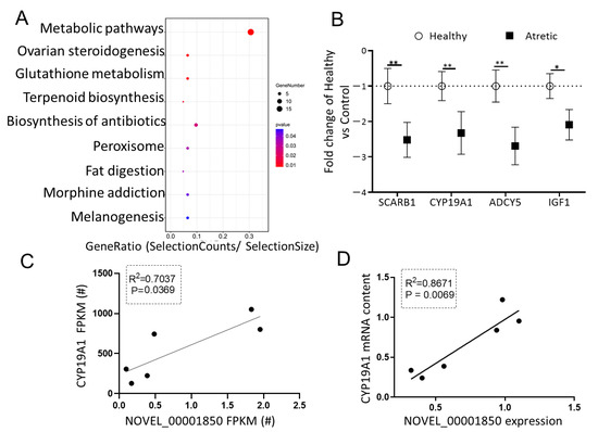 The putative role of NOVEL_00001850. (A) KEGG analysis of potential down-regulated targets of NOVEL_00001850 top three miRNA binding sites. The size and color of each bubble represents the number of genes in each pathway and P value respectively. (B) Validation of selected downregulated genes using qRT-PCR. Gene expression as fold change of atretic over healthy follicles (n = 3), with no change indicated as 1. Healthy: open circles, Atretic: filled squares. (C) Correlation of FPKM levels by RNA-Seq of NOVEL_00001850 and CYP19A1. (D) Correlation of expression levels by qRT-PCR of NOVEL_00001850 and CYP19A1. Data as mean ± SD. *, p < 0.05; **, p < 0.01.