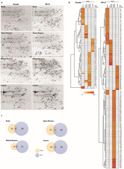 In the 2-D electrophoresis analyses, different numbers of proteins were identified depending on the plant organ and the accession. Representative 2-D protein patterns are shown in Figure 1a. In the 2-D maps of flower bud proteins, we detected 1189 protein spots in Panda and 1159 in PA15. There were fewer protein spots in the 2-D maps produced from open flowers, namely 900 for Panda and 977 for PA15. In the 2-D maps produced from unpollinated wilted flowers, there were 1117 protein spots for Panda and 1097 for PA15. The smallest numbers of protein spots were detected in donor leaf samples, namely only 701 for Panda and 826 for PA15.
