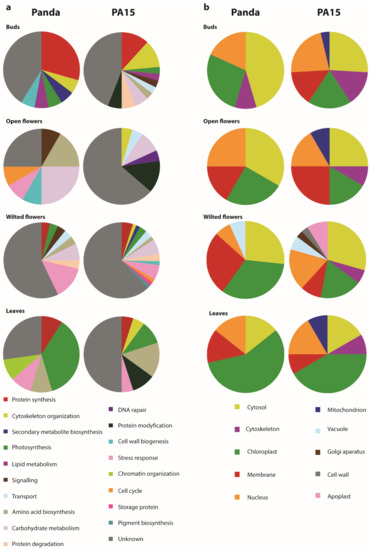 Composite graph showing heat-affected proteins in different organs of Panda and PA15 buckwheat accessions: (a) Biological functional categorization of heat-affected proteins; (b) distribution of identified proteins according to subcellular location; proteins with two and more localizations in the cell were assigned to all places. Biological function and subcellular localization were assigned based on information in the UniProt database.