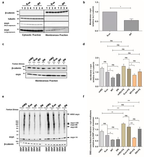 To induce αsyn aggregation, oxidative stress was applied to the cells as described by Macchi et al. with a few modifications []. One day after plating the cells in 10 cm dishes, cells were treated with 5 mM freshly prepared FeCl2 (Sigma-Aldrich, Saint Louis, MO, USA) and 100 µM H2O2 (Sigma-Aldrich, Saint Louis, MO, USA) in DMEM-complete (filtered through a 0.45µm filter (Merck Millipore, Burlington, MA, USA)). After 72 h, cells were washed with PBS and scraped for immunoblotting or intact cell cross-linking.
