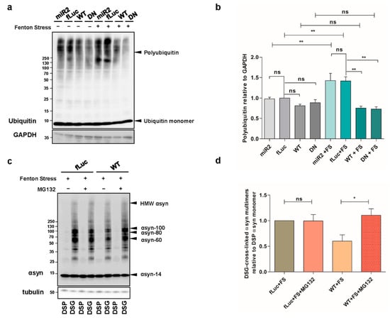 ATP13A2 inhibits αsyn multimerization via regulating the ubiquitin-proteasome system (UPS). (a) Visualization of ubiquitin levels in cell lysates from ATP13A2 KD, fLuc, ATP13A2 WT, and ATP13A2 DN cells without and with oxidative stress treatment. Glyceraldehyde 3-phosphate dehydrogenase (GAPDH) levels were used as standard. (b) Quantification of polyubiquitin levels relative to glyceraldehyde 3-phosphate dehydrogenase (GAPDH) (n = 4). Statistical analysis was performed using a one-way ANOVA test with Bonferroni. The error bars represent the SEM. ** p < 0.01, ns, not significant. (c) Visualization of αsyn multimers after cross-linking in fLuc and ATP13A2 WT cells under oxidative stress without and with 1 µM MG132. (d) Quantification of αsyn multimer-to-monomer ratio (n = 4). Statistical analysis was performed with column statistics (one-sample t-test) comparing test values to the hypothetical value of 1. * p < 0.05, ns, not significant.
