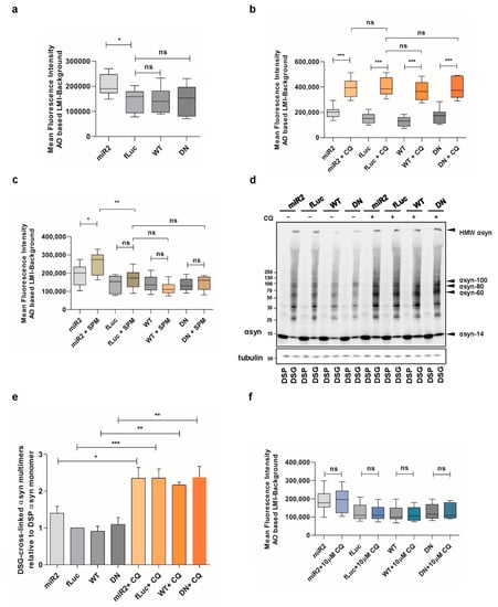 Of note, high CQ concentrations also induced a pronounced increase of αsyn multimers independent of ATP13A2 (Figure 6d,e or Figure A5, Appendix A), while low concentrations of CQ had no effect on αsyn multimerization both in basal and oxidative stress condition (Figure A3b,c, Appendix A). Thereafter, we studied the integrity of lysosomal membrane following the challenge with 10 µM CQ for 24h and confirmed that low concentrations of CQ are not sufficient to induce the damage of lysosomal membranes (Figure 6f), demonstrating that stress-induced lysosomal membrane damage may be linked to αsyn multimerization.