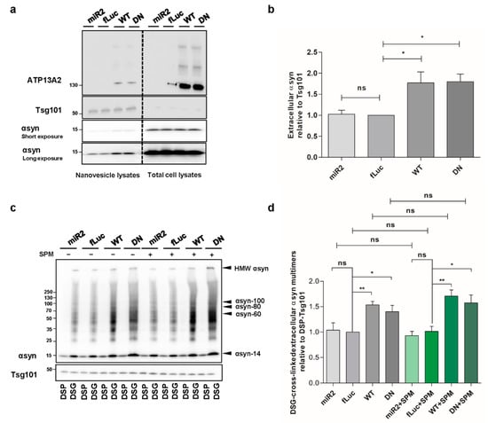 Spreading of aggregated αsyn is considered as a key event in PD progression. Since ATP13A2 was reported to regulate the biogenesis of exosomes and promote αsyn secretion [,], we aimed to determine whether this effect relies on the ATPase function of ATP13A2. Therefore, we set out to investigate the level of extracellular αsyn carried by nanovesicles derived from the plasma membrane in our different cell models. By loading the same concentration of nanovesicle proteins, we found that overexpression of ATP13A2 WT and transport-deficient mutant ATP13A2 DN significantly increases the level of αsyn in nanovesicles (Figure 7a,b), suggesting that αsyn externalization is regulated by ATP13A2 via transport independent roles. Next, we performed cross-linking on the harvested intact nanovesicles to assess the level of αsyn multimerization in the secreted nanovesicles. We found that secretion of αsyn multimers was promoted by ATP13A2 WT and DN, while ATP13A2 KD did not have any significant effect. Treatment with SPM did not affect the secretion of αsyn multimers in any of the cell lines in line with the transport-independent effect of ATP13A2 on nanovesicle secretion, further indicating that nanovesicle secretion is not affected by lysosomal dysfunction (Figure 7c,d). Collectively, these data suggest that ATP13A2 can promote extracellular secretion of αsyn multimers through a transport-independent mechanism.