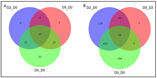 Differentially expressed (A) miRNA and (B) mRNA at day 2 vs. day 0 (D2_D0, myoblast to early myocyte), day 5 vs. day 0 (D5_D0, myoblast to mature myocyte), and day 5 vs. day 2 (D5_D2, early myocyte to mature myocyte).