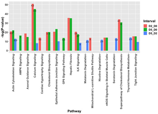 The differentially expressed mRNAs were analyzed for functional enrichment in biological pathways (Figure 2). Overall, the pathway changes present on D2 vs. D0 were also seen on D5 vs. D0 comparison. Calcium signaling was upregulated with the greatest significance and positive z-score in both D2 and D5 compared to D0. Actin cytoskeleton signaling and cholesterol synthesis pathways also had positive z-scores in D2_D0 and D5_D0 comparisons. In contrast, the actin cytoskeleton pathway was downregulated on D5 vs. D2 comparison. Meanwhile, mitochondrial L-carnitine shuttle was uniquely enriched on D2 vs. D0 comparison while AMPK and G6P signaling pathways were upregulated on D5 vs. D0 comparison. Pathways significantly upregulated on D5_D2 comparison were: metabolism of thyroid hormone, nicotine, melatonin, and serotonin.