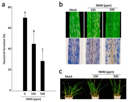 NMN, a precursor of NAD, enhances resistance to F. graminearum [], and NAD levels increase upon infection by Bgh [], suggesting that NMN is also involved in resistance to Bgh. Therefore, we first investigated the effect of NMN on the resistance using epidermal single-cell layers of coleoptiles, which are easy to treat with chemicals and observe during the infection process. Bgh, an obligate biotrophic fungus, penetrates the host epidermal cells and forms haustorium, which must absorb nutrients to survive. Therefore, the haustorial formation is a criterion to evaluate whether the infection is successful or not. The coleoptile epidermal cells prepared as a single-cell layer are in direct contact with chemicals because there is no cuticle on their lower surface. Inoculation of Bgh conidia after 12 h of NMN pretreatment resulted in a significant decrease in the rate of haustorial formation in a concentration-dependent manner (Figure 1a). Additionally, when NMN was administered by absorption from the roots, the effect of NMN was observed even though the conidia were inoculated at a high density (Figure 1b). Since the infection rate of Bgh decreases when the host is not healthy, we investigated the possibility that NMN treatment might affect plant growth and found that NMN did not inhibit growth even at 500 ppm, where the effect was pronounced (Figure 1c). These results suggest that NMN has an inhibitory effect on biotrophic invasion by Bgh.