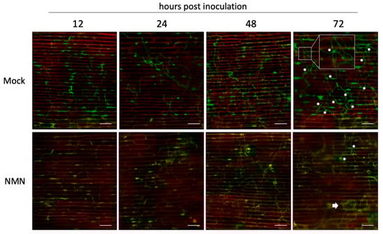 To analyze the infection behavior of F. graminearum on coleoptile epidermal cells, we used a strain that constitutively expresses GFP. The coleoptile epidermal cells were inoculated 1 h after treatment with 500 ppm NMN, and sequential morphological changes were observed. The plasma membranes were stained with FM4-64 to facilitate observation of the host epidermal cell shape. A couple of hours after inoculation, conidia germinated, and hyphae elongated vigorously. After that, however, hyphae tended to grow slightly weaker on NMN-treated coleoptile epidermal cells (Figure 2).