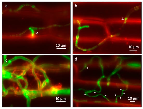 Hyphal structures of Fusarium graminearum on coleoptile epidermal cells. (a) The appressoria-like structure of F. graminearum on the mock-treated cells 12 h post inoculation (hpi). The arrowhead indicates an appressorium-like structure. (b) The invaded hypha penetrates the neighboring cell of the mock-treated coleoptile 24 hpi. The arrowhead indicates a constricted invasive hyphal peg. (c) The invasive hyphae surrounded by the host cell membranes of the mock-treated coleoptile 24 hpi. (d) The wandering hyphae on the coleoptile epidermal cells treated with 500 ppm NMN 12 hpi. The asterisks indicate the turning points with slight strong fluorescence.