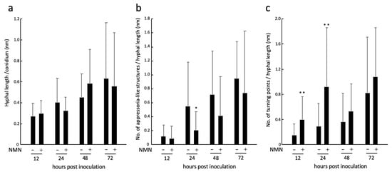 Hence, we investigated in detail how NMN treatment affects the morphology of F. graminearum. When the length of hyphae per conidium at each time was compared, there was no significant difference between the mock and NMN treatments (Figure 4a). Next, we examined how many appressoria-like structures were formed on the hyphae. The results show that the number of appressoria-like structures was significantly reduced by NMN treatment at 24 hpi (Figure 4b). Appressoria-like structures are also observed in wheat as early infection structures that adhere tightly to the surface of coleoptile epidermal cells []. Similarly, the structures are also formed during penetration of neighboring epicarp cells from hyphae within the invaded cells []. F. graminearum can penetrate through the tip of a straight hypha, so a distinctly formed appressoria-like structure may be dispensable but could help increase the chance of penetration by making the small hyphal branches. The rice blast fungus Magnaporthe oryzae increases the turgor pressure inside the appressorium to 8.0 MPa and breaks through the leaf cuticle surface by physical rupture []. On the other hand, the turgor pressure inside the appressorium is not so high in Bgh, and melanin is not accumulated to maintain the turgor pressure. Therefore, it would not be only physical forces that penetrate the cell wall []. Bgh may secrete proteins necessary for penetration from the tip of the appressorium []. Likewise, F. graminearum probably secretes proteins such as cell-wall-degrading enzymes from the tips of the appressoria-like structures in order to penetrate host cells. The co-localization of the tip of the appressoria-like structure with the host cell membrane stained with FM4-64 suggests that it interacts with the host (Figure 3a). The number of turning points was significantly higher on NMN-treated coleoptile epidermal cells at 12 and 24 hpi (Figure 4c). In the process of elongation, hyphae encounter host responses induced by NMN, which are unfavorable to F. graminearum, possibly making it difficult for direct penetration or subsequent formation of mature appressoria-like structures at 24 hpi (Figure 4b). As a result, hyphae may exhibit a wandering morphology (Figure 2 and Figure 3d). After 72 h of inoculation, each hypha could grow on the NMN-treated coleoptile epidermal cells as in the control, but the degree of hyphal entanglement was low (Figure 2). In Stage II, hyphae elongate in all directions on the surface of the epidermis and become entangled with each other to form lobate appressoria and consequent infection cushions []. The NMN-mediated suppression of disease in spikelets [] suggests that NMN could affect these fungal growth phases, though this remains to be studied. It is not feasible to quantitate the degree of entanglement. The lifespan of single-layered coleoptile epidermal cells is not long enough to observe the infection cushion formation. Qiu et al. (2019) also did not observe the formation of infection cushions in wheat coleoptile epidermal cells. Therefore, the development of a new experimental system using lemma and palea is necessary to evaluate NMN effects on hyphal entanglement and infection cushion formation after Stage II.