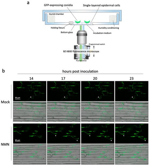 Real-time imaging of infection behavior of Fusarium graminearum on coleoptile epidermal cells treated with 500 ppm NMN. (a) Real-time monitoring system for infection behavior of F. graminearum. (b) Three hours after inoculation and thereafter, the fluorescence was automatically photographed every 30 min. The real-time imaging was supplemented as video files (Videos S1–S4). The arrowheads indicate an appressorium-like structure. The asterisks indicate winding hyphae.