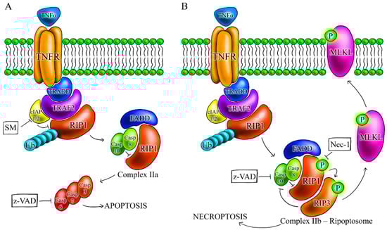 - Micheau, O.; Tschopp, J. Induction of TNF receptor I-mediated apoptosis via two sequential signaling complexes. Cell 2003, 114, 181–190. [Google Scholar] [CrossRef]