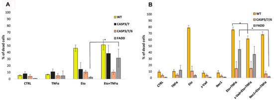 2.3. Apoptosis Is the Primary Cell Death in WT Cells, While FADD- and CASP3/7/6-Deficient Cells Die by RIP1-Dependent Necroptosis