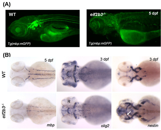- Lee, Y.R.; Kim, S.H.; Ben-Mahmoud, A.; Kim, O.H.; Choi, T.I.; Lee, K.H.; Ku, B.; Eum, J.; Kee, Y.; Lee, S.; et al. Eif2b3 mutants recapitulate phenotypes of Vanishing White Matter Disease and validate novel disease alleles in zebrafish. Hum. Mol. Genet. 2021. [Google Scholar] [CrossRef] [PubMed]