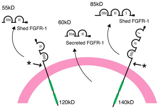 Schematic illustration of the full-length transmembrane FGFR-1 receptors showing the two and three Ig-like extracellular domains (IIIc) that are proteolytically cleaved from the cell surface. A two-loop ectodomain of FGFR-1 is expressed from an alternatively spliced transcript of mRNA and secreted into the extracellular milieu without proteolytic processing.