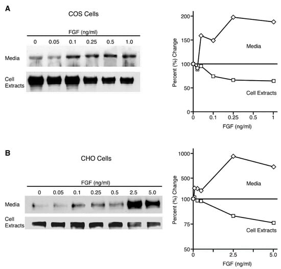 COS 7 cells transfected with FGFR-1/pcDNA3 were rinsed three times with phosphate buffered saline (PBS) and incubated in 2 mL of serum-free OptiMem medium (Life Technologies, Gibco BRL) for 2–24 h, depending on the experiment, at 7% CO2 and 37 °C. The conditioned medium was collected and clarified by centrifugation to remove cellular debris and 1.8 mL was incubated with WGA (wheat germ agglutinin)-Sepharose beads (25 µL bead volume) overnight at 4 °C on a rocker to precipitate the FGFR-1 ectodomain. Following the incubation period, the beads were collected, washed three times in PBS, and boiled in SDS sample buffer. The shed FGFR-1 ectodomain was detected by immunoblot analysis. A semi-quantitative analysis of the FGFR-1 receptor signals was carried out using the public domain NIH Image program (developed at the U.S. National Institutes of Health.