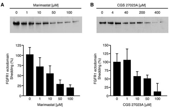 A diverse group of membrane proteins are shed by a mechanism which is sensitive to metalloprotease inhibitors []. To examine whether the constitutive and ligand-activated FGFR-1 ectodomain shedding is also dependent on this system, we tested the effect of metalloprotease inhibitors on the release of the FGFR-1 ectodomain in COS 7 cells. Cells treated with the metalloprotease inhibitors—marimastat and CGS27023A—showed a dose-dependent decrease in constitutive FGFR-1 ectodomain shedding (Figure 7). FGF-2-activated shedding was also inhibited. There was no evidence of cytotoxicity (data not shown).