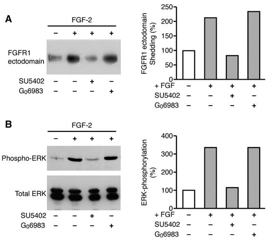 We also examined whether stimulation of the FGF receptor tyrosine kinase signaling pathway was necessary for ligand-activated FGFR-1 ectodomain shedding. We analyzed the levels of the shed FGFR-1 ectodomain in the conditioned media of FGFR-1 CHO cells treated with FGF-2 in the presence or absence of a specific inhibitor of the FGF receptor tyrosine kinase—SU5402 []. We found that FGF-2 induced the ectodomain shedding of FGFR-1 and that SU5402 reduced FGF-2-activated FGFR-1 ectodomain shedding to the level observed with constitutive shedding (Figure 10A). Controls showed that FGF-2-activated shedding was associated with ERK phosphorylation, which was blocked by the FGFR-1 tyrosine kinase inhibitor SU5402 (Figure 10B). These data suggest that ligand-activated FGFR-1 ectodomain shedding occurs through a mechanism that involves FGF receptor tyrosine kinase signaling (Figure 10B).