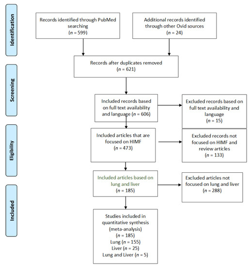 Utilizing our inclusion and exclusion criteria, 606 studies were deemed eligible for assessment (Figure 1). All case reports were excluded. Of these articles, 133 were excluded because they did not explicitly mention HIMF or because they were review articles. Further, 473 articles were deemed appropriate for further analysis. Of these, 288 articles were removed because they did not focus on the pulmonary or hepatic systems. We identified 185 full-text articles that included information about HIMF at an organ-specific level. Of these 185 articles, 155 included information about HIMF in the pulmonary system, 25 included information about HIMF in the liver, and 5 included information about HIMF in both the pulmonary system and the liver. Among the 155 articles about HIMF in the pulmonary system, 6 utilized human subjects, 142 utilized a murine model, and 7 utilized both human and murine models. Within the articles discussing HIMF in the liver, all 25 utilized murine models. Finally, within the articles discussing HIMF in both the pulmonary system and liver, all five utilized murine models.