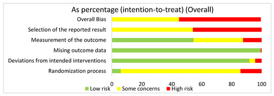 The overall risk of bias for all the articles in the dataset was a high risk of bias (54.6%) and some concerns (44.8%). The selection of the reported result had a high risk of bias (45.9%) and some concerns (54.1%). The measurement of the outcome had a high risk of bias (12.4%), some concerns (33%), and low risk of bias (54.6%). The missing outcome data domain had a low risk of bias (99.5%) and a high risk of bias (0.5%). Deviations from intended interventions had a low risk of bias (91.9%), some concerns (3.8%), and high risk of bias (4.3%). The randomization process had a high risk of bias (14.1%), some concerns (80%), and low risk of bias (5.9%).