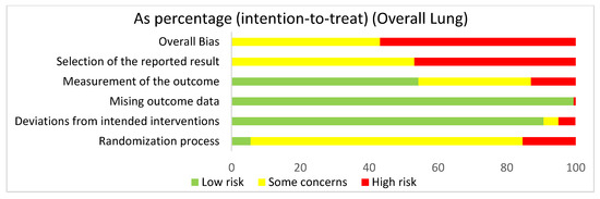 The overall risk of bias for all of the lung studies was a high risk of bias (56.8%) and some concerns (43.2%). The selection of the reported result had a high risk of bias (46.9%) and some concerns (53.1%). The measurement of the outcome had a high risk of bias (13%), some concerns (32.7%), and low risk of bias (54.3%). The missing outcome data domain had a low risk of bias (99.4%) and a high risk of bias (0.6%). Deviations from intended interventions had a low risk of bias (90.7%), some concerns (4.3%), and high risk of bias (4.9%). The randomization process had a high risk of bias (15.4%), some concerns (79%), and low risk of bias (5.6%).