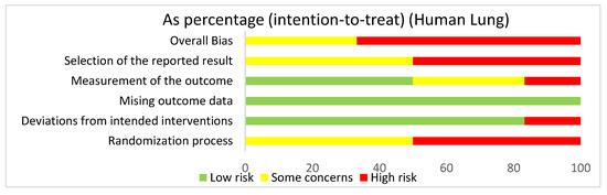 The overall bias for studies regarding the lung utilizing human subjects was a high risk of bias (66.7%) and some concerns (33.3%). The selection of the reported result had a high risk of bias (50%) and some concerns (50%). The measurement of the outcome had a high risk of bias (16.7%), some concerns (33.3%), and low risk of bias (50%). The missing outcome data domain had a low risk of bias of 100%. Deviations from intended interventions had a low risk of bias (83.3%) and a high risk of bias (16.7%). The randomization process had a high risk of bias (50%) and some concerns (50%).