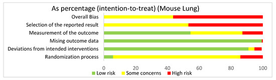 The overall bias for the studies regarding the lung utilizing mouse models was a high risk of bias (56.4%) and some concerns (43.6%). The selection of the reported result had a high risk of bias (46.8%) and some concerns (53.2%). The measurement of the outcome had a high risk of bias (12.8%), some concerns (32.7%), and low risk of bias (54.5%). The missing outcome data domain had a low risk of bias (99.4%) and a high risk of bias (0.6%). Deviations from intended interventions had a low risk of bias (91%), some concerns (3.8%), and high risk of bias (4.5%). The randomization process had a high risk of bias (14.1%), some concerns (80.1%), and low risk of bias (5.8%).
