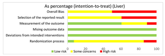 The overall bias for all the studies regarding the liver was a high risk of bias (50%) and some concerns (50%). The selection of the reported result had a high risk of bias (39.3%) and some concerns (60.7%). The measurement of the outcome had a low risk of bias (60.7%), some concerns (28.6%), and high risk of bias (10.7%). The missing outcome data and the deviations from intended interventions domain had a low risk of bias of 100%. The randomization process had a high risk of bias (14.3%), some concerns (78.6%), and low risk of bias (7.1%).