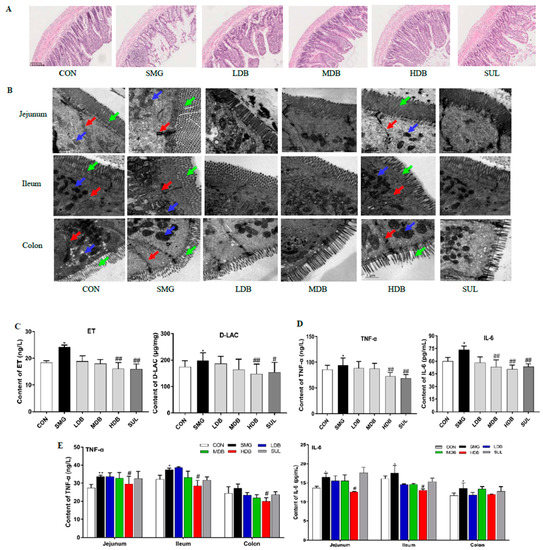 Endotoxin (ET) and D-Lactate have been used as indices to reflect the high permeability of intestinal epithelia [37]. As shown in Figure 1C, 28d-SMG remarkably increased plasma D-LAC and ET concentrations (p < 0.05, compared with the CON group). After SMG rats were orally administrated with three doses of DB, DB significantly decreased the levels of D-LAC and ET in the rat plasma in a dose-dependent manner (p < 0.01, compared with the SMG group). This result indicated that HDB could reduce the high permeability of the small intestine under SMG conditions. SMG could also trigger the inflammatory responses in rats, and the elevated inflammatory factors can aggravate the intestinal barrier dysfunction [38]. Figure 1D showed that HDB remarkably decreased TNF-α tumor necrosis factor-α (TNF-α) and interleukin-6 (IL-6) plasma levels in SMG rats (p < 0.01, compared with the SMG group). Increased TNF-α levels in SMG rats’ ileum, jejunum, and colon were reduced by HDB. HDB decreased the IL-6 content in SMG rat’s ileum and jejunum (Figure 1E). These results indicated that DB decreased permeability and attenuated inflammation in SMG rats. DB at 2 g/kg exhibited the best protective effect on IEB dysfunction induced by SMG and contributed most to the rat ileum and jejunum repair, followed by the rat colon.