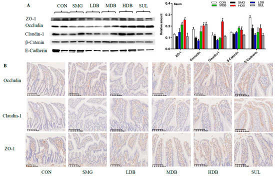 DB protected the intestine epithelial barrier (IEB) injury via increasing the expression of TJ and AJ proteins in ileum of SMG rat. (A) the expression of ZO-1, occludin, claudin-1, β-catenin and E-cadherin determined by Western-blot (n = 9). (B) the expression of occludin, claudin-1and ZO-1 detected by immunohistochemistry (brown granules represent TJ proteins) in SMG rat ileum tissues (ruler scale of 100 µm, n = 9). Note: * p < 0.05, compared with CON group. # p < 0.05, compared with SMG group. The relative expression levels of proteins were expressed as the ratio of gray value of the target band to that of total proteins in the same sample. The total protein gel was shown in Supplementary Figure S2.