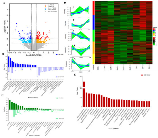 Differentially expressed proteins (DEPs) in ileum of SMG rats with DB treatment were clustered and functionally annotated. (A) the volcanic map of DEPs in DB/SMG group. (B) biological process classification of DEPs. (C) cellular component classification of DEPs. (D) heatmap of DEPs with 5 clusters. (E) KEGG pathways of DEPs in DB/SMG group.