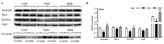 Compared with the CON group, SMG treatment showed that Dock180, Rac1, WAVE2 and Arp3 decreased by 41.3%, 14.4%, 31.1%, and 21.0% (p < 0.05), respectively (shown in Figure 4). DB treatment could dramatically upregulate the expression of these proteins with the fold of 51.9% (Dock180), 14.4% (Rac1), 34.4% (WAVE2), and 15.6% (Arp3) (p < 0.05). The F-actin to G-actin ratio in the DB group increased by 46.6% compared with that in the SMG group. These results demonstrated that DB could promote FA formation through regulating the Rac1-WAVE2-Arp3 pathway, which may contribute to the migration of IECs and help repair epithelial barrier damage under SMG conditions.