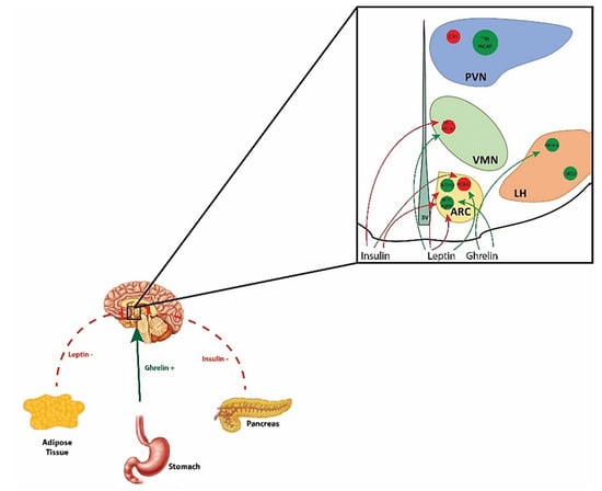 Energy homeostasis, the intricate balance between energy intake and expenditure, is regulated in coordinate fashion by homeostatic and hedonic neural circuits [1]. Aberrations in these circuits are implicated in the pathophysiology of conditions such as obesity, type-II diabetes, and food addiction [2,3,4,5]. Homeostatic control of energy balance is attributed to the hypothalamic energy balance neural circuitry, which integrates information relayed from the brainstem regarding the energy/nutritional status of the organism, based on chemical and mechanical cues from the gastrointestinal (GI) tract [6,7]. These communications are ultimately encoded by various hypothalamic nuclei and their associated neuronal populations, including those in the arcuate nucleus (ARC), ventromedial nucleus (VMN), lateral hypothalamus (LH), dorsomedial nucleus (DMN), and the paraventricular nucleus (PVN); producing orexigenic and anorexigenic signals to, respectively, stimulate and suppress energy intake as well as altering energy expenditure [1,8].